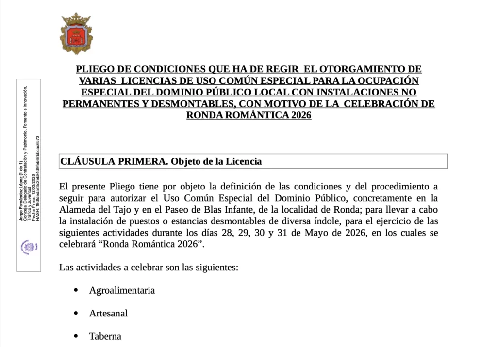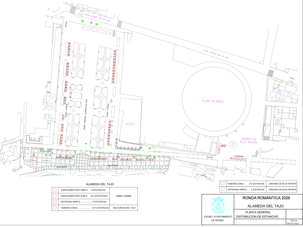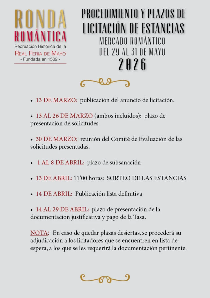 El Ayuntamiento ha licitado las 81 ESTANCIAS (dos de ellas para la Comarca Natural) que compondrán este año la nueva edición de ‘Ronda Romántica’. Se inicia el proceso de licitación de las diferentes estancias que conformarán este año ‘Ronda Romántica’. Los lugares de la Fiesta serán: Alameda del Tajo y Paseo Blas Infante.